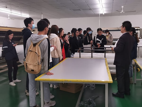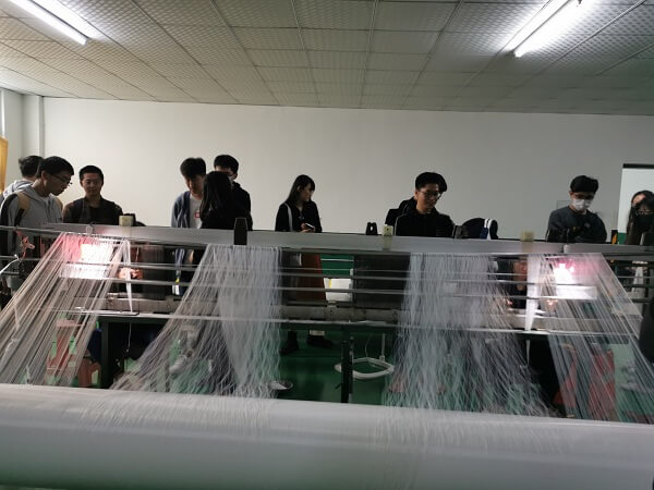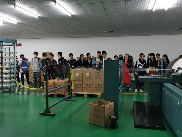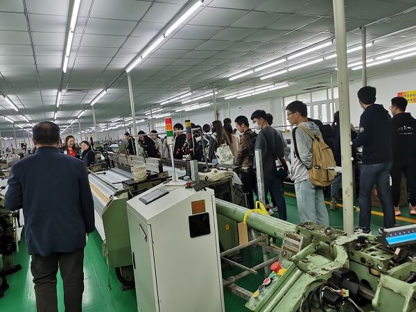 Firstly, Mr liu, the manager of our factory gave an general introduction of shangshai. Then the students have an visit to the work shope of warping-Drawing In Reed-weaving-heating and setting-final goods to see how the yarn weave to mesh. The students try to apply what they learn to the real factory working, and ask questions to the workers there.